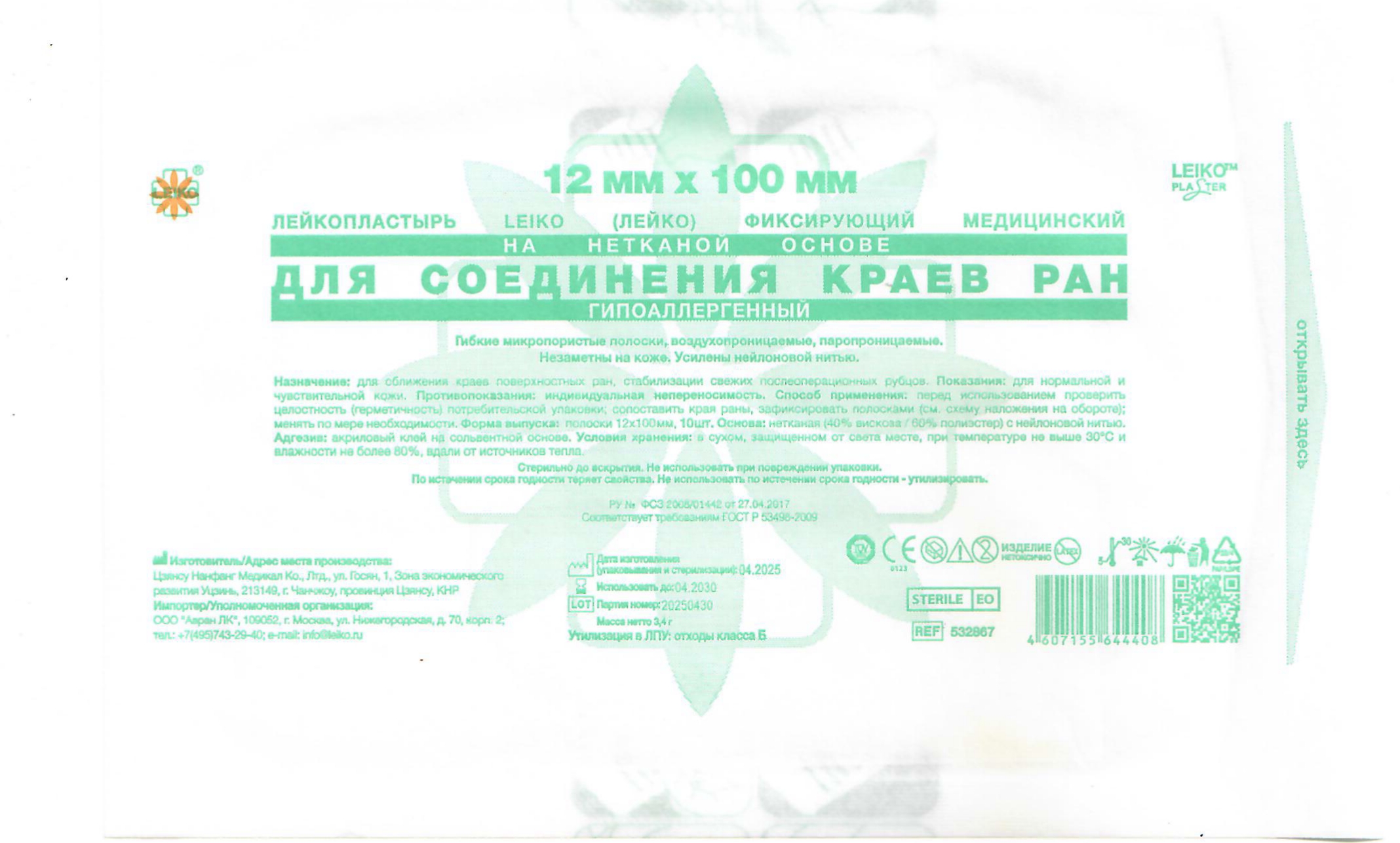 Лейкопластырь LEIKO (ЛЕЙКО) фиксирующий медицинский на нетканой основе, для соединения краев ран, гипоаллергенный 12мм x 100мм - предназначен для сближения краёв поверхностных ран и стабилизации свежих послеоперационных рубцов.